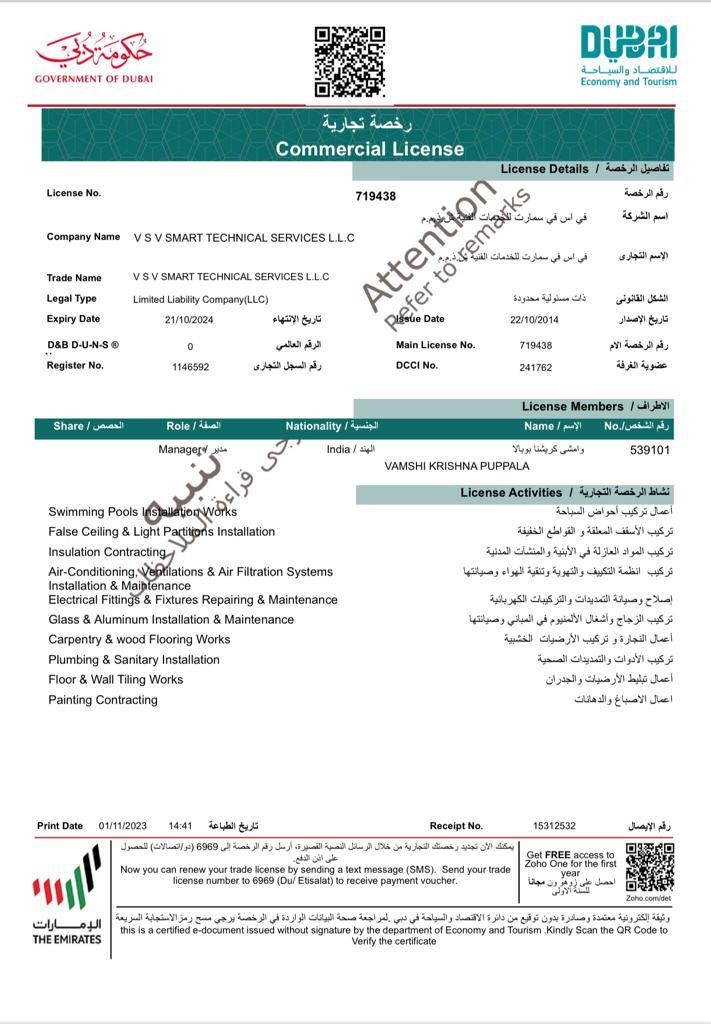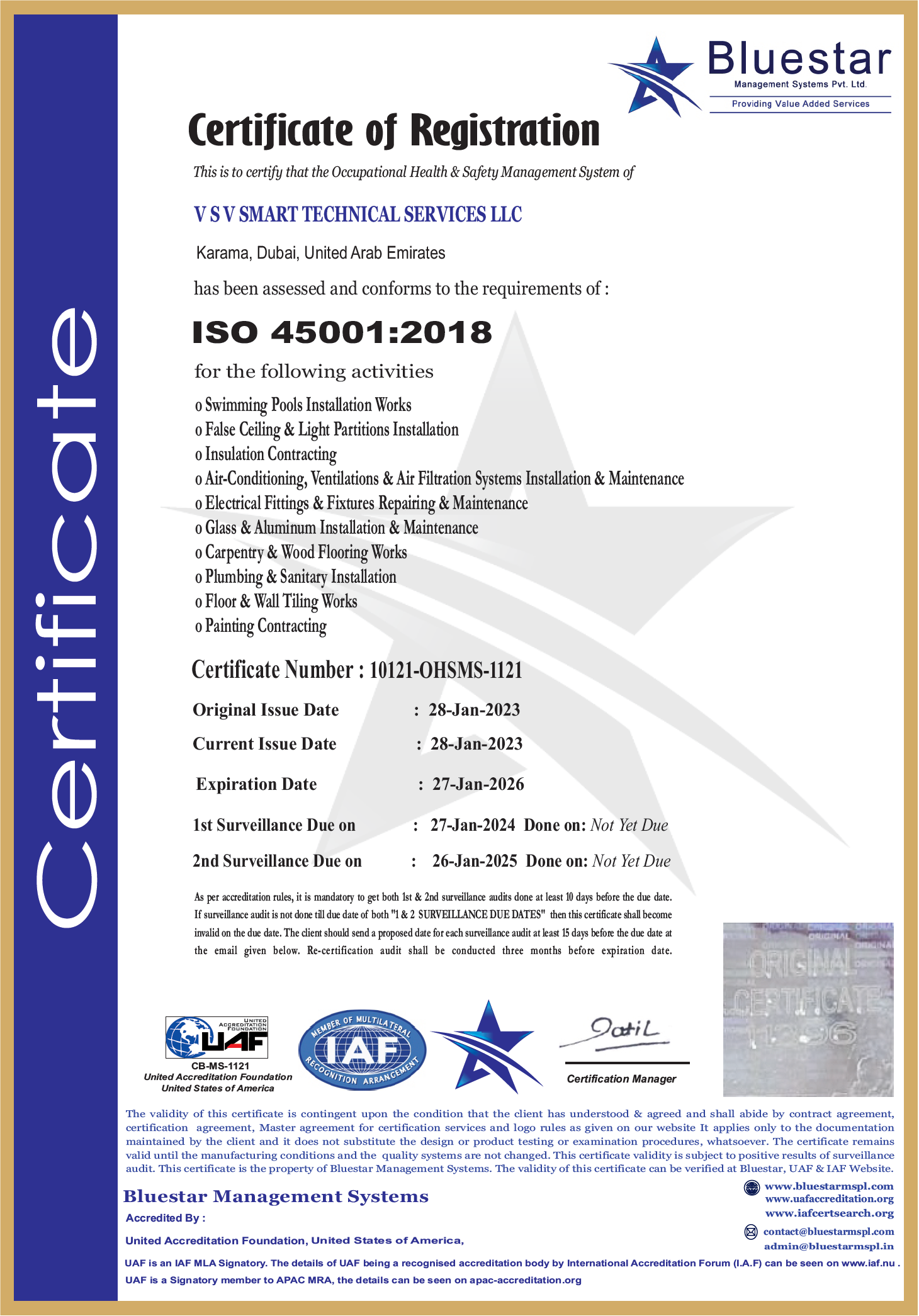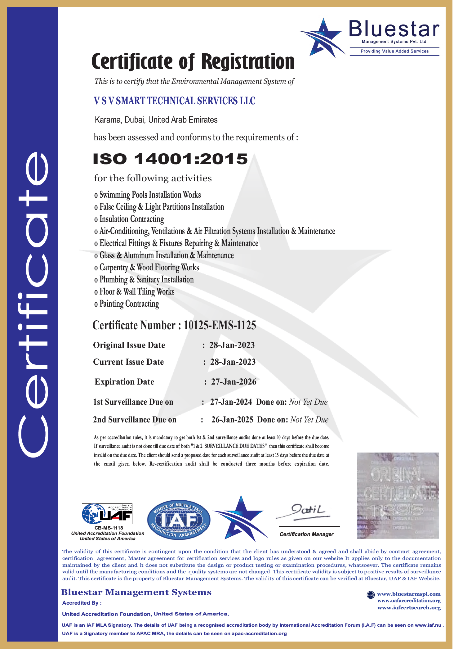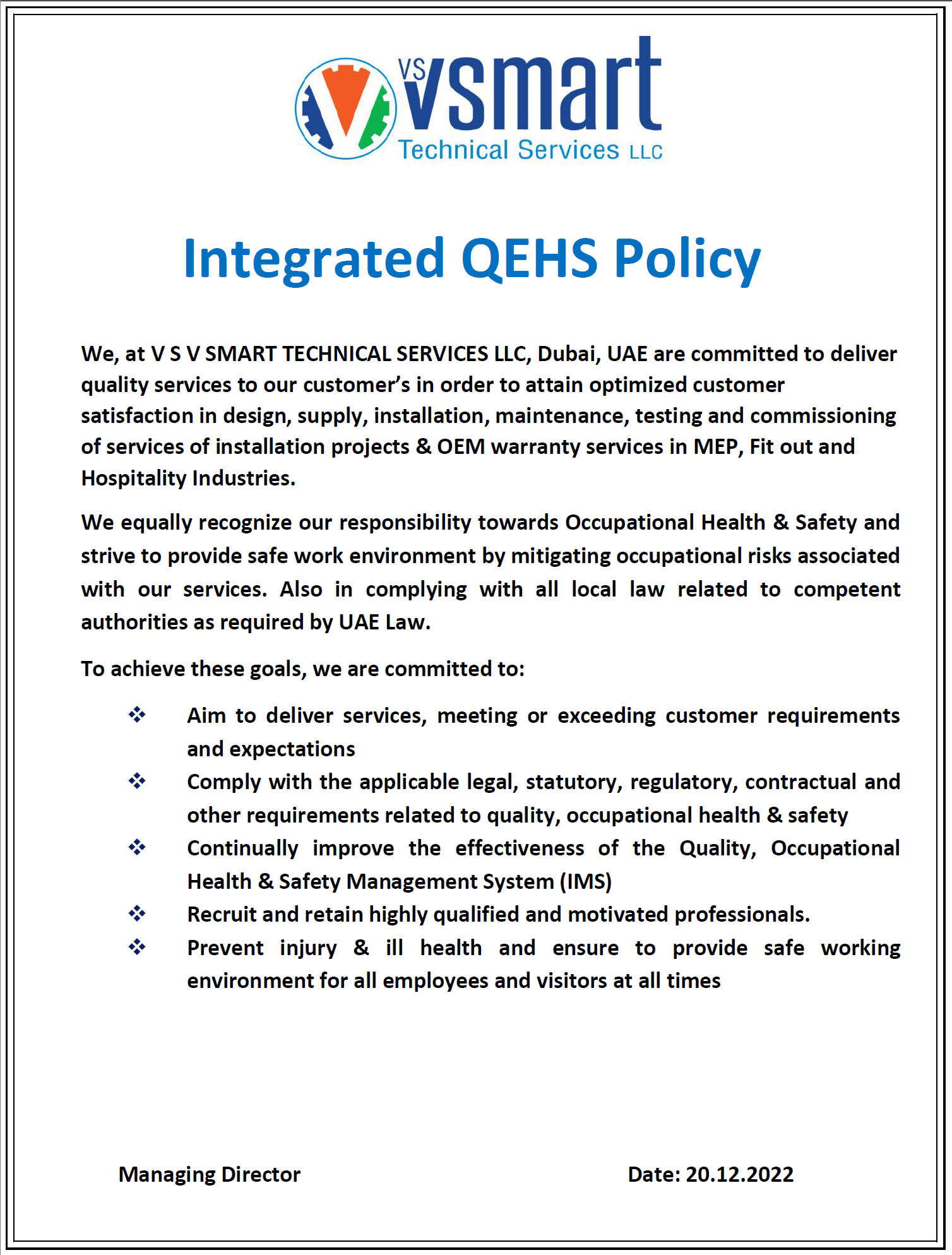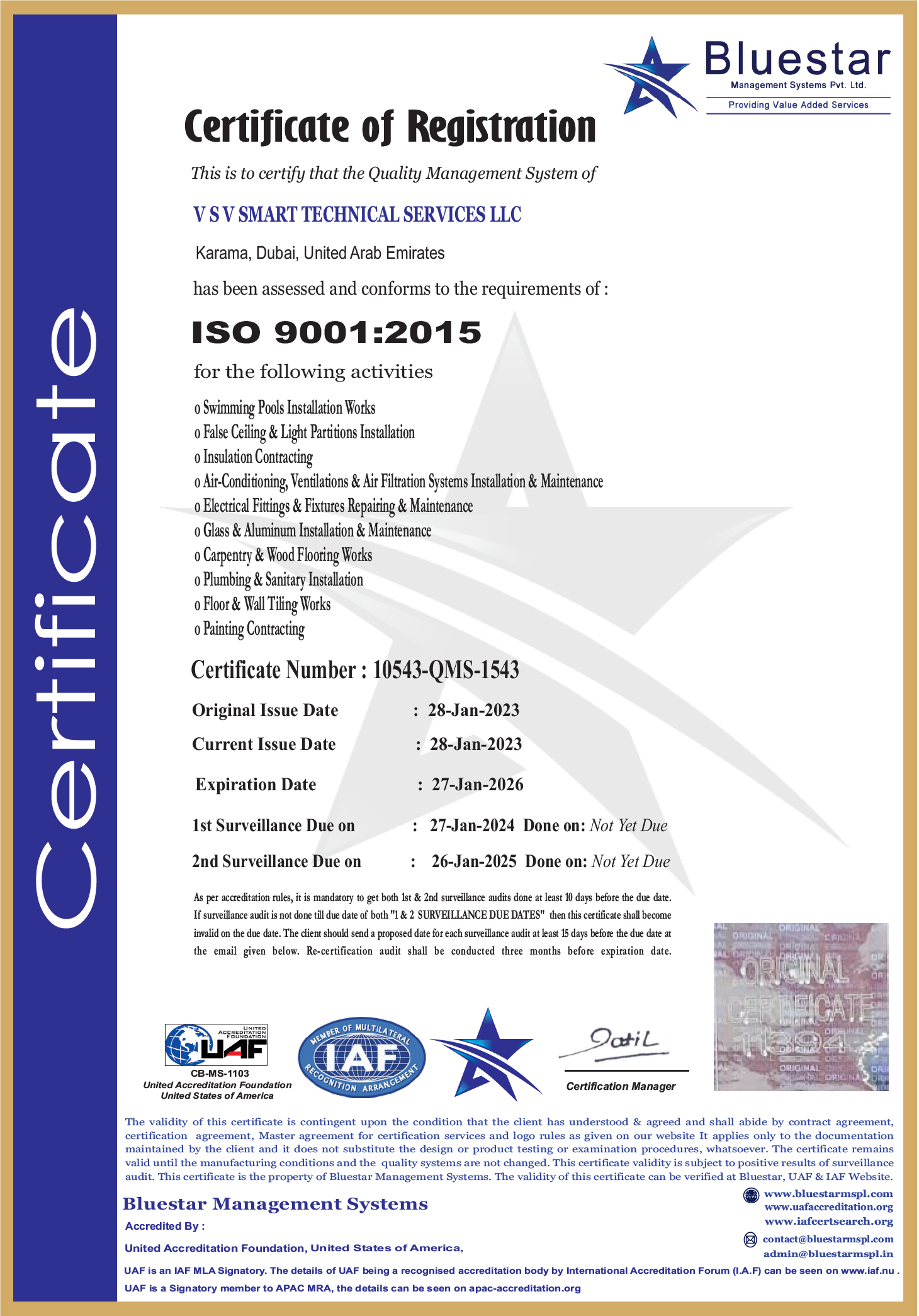 V S V SMART Technical Services L.L.C is a dynamically organized company, operating in the United Arab Emirates, activity engaged in the growing Total Interior Fit-out solutions, all kind of Hospitality Industries works and Electro-Mechanical industry. As a specialized company in the Maintenance and Environmental Technologies Sector, the company is always seeking new and quality innovative leading-edge technologies in various sectors of industry.